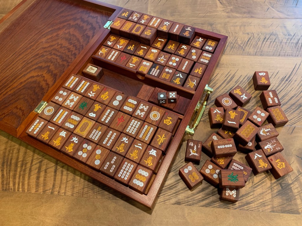 My most expensive set is a rosewood set from the same eBay store with beautiful rosewood tiles and a nice wood case that set me back around $95. It’s gorgeous and lightweight, and it smells and feels like playing with Lincoln Logs, like in elementary school. It doesn’t have quite the same satisfying clack as regular acrylic tiles. I play with it about ⅓ of the time just cuz it’s so pretty, and it’s light enough to travel.