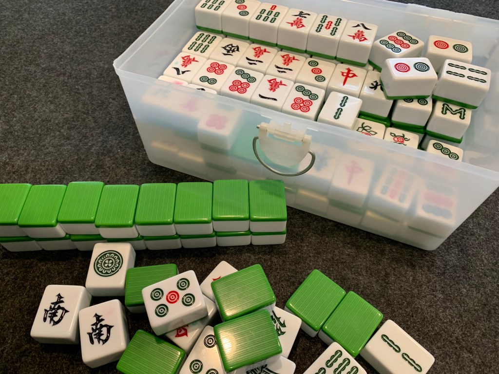 The final consideration, of course, is price point. I have never spent more than $100 on a mahjong set, although I have definitely salivated over some of the more expensive sets. My favorite set, with extra large tiles, was around $50 from a strangely named eBay store called “wepayyoursalestax” [sic]. As mentioned above, I love the size, feel, and visibility of the tiles. But the case is pretty bad (it’s shaped like a plastic toolbox with a flimsy handle and the tiles are fairly loose without trays so they click around). I see similar extra large sets on Amazon and eBay with better cases for around $60.