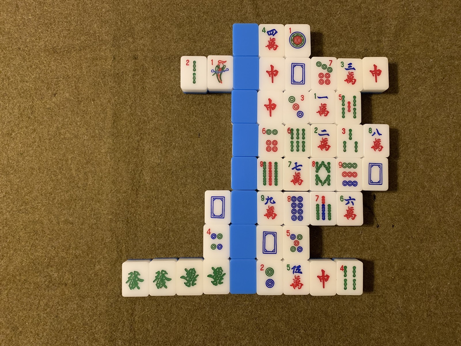 Have a mahjong set, but none of your friends want to play? Are you stuck in quarantine, or just need some you time all to yourself? This is based on a fun mahjong solitaire app, but adapted for play with physical mahjong tiles. The app depicts mahjong cards, which stack differently from tiles. I found that transposing the set up so that the tiles stack in a horizontal direction works better. This is a fun game that rewards patience and planning ahead. As far as I can tell, every game seems to be solvable at the outset, but it’s easy to paint yourself into a corner if you’re not careful.