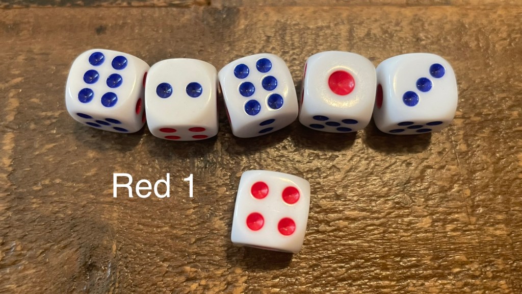 • Six dice (preferably Chinese dice, which have red pips for the 1 and 4 faces)