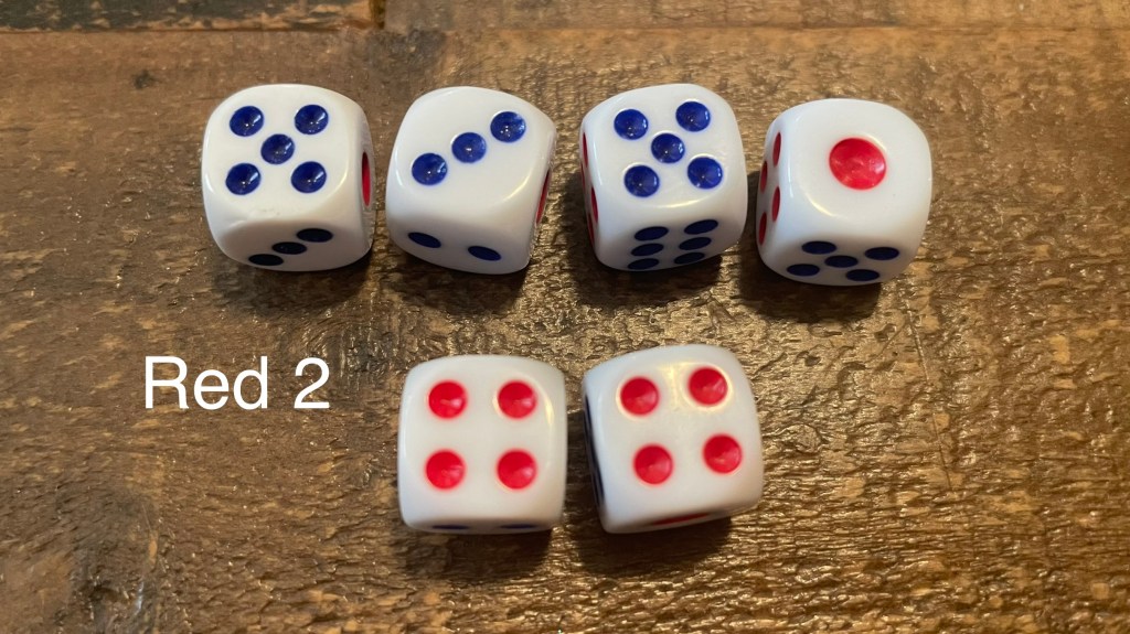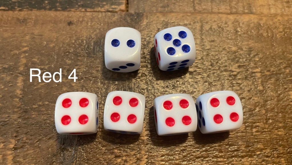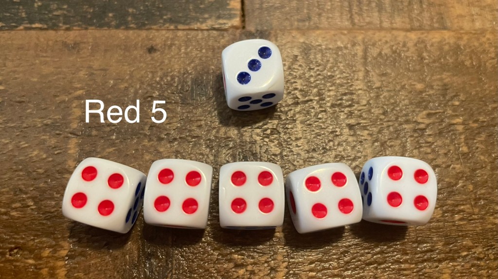 • For Red 4, Same 5, and Same 6 combinations of equal value, the sum of the unmatched one or two dice will determine the ranking. For example if two players have Red 4 combinations of 4-4-4-4-1-6 and 4-4-4-4-3-5 respectively, the 4-4-4-4-3-5 will be more highly ranked, because the sum of its unmatched dice (3+5=8) is higher than the other (6+1= 7).
