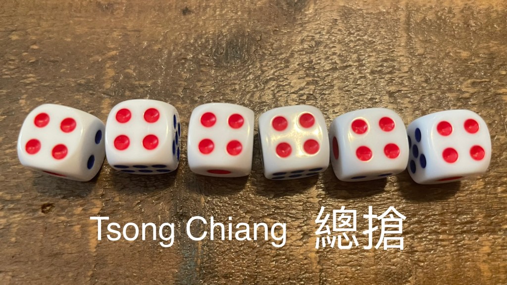 Tsong Chiang 總搶 means total grab or winner takes all in Hokkien. It is awarded for the most elusive roll of a Red 6. Tsong Chiang immediately ends gameplay and the winner is awarded all prizes, including the ones that have already been handed out.