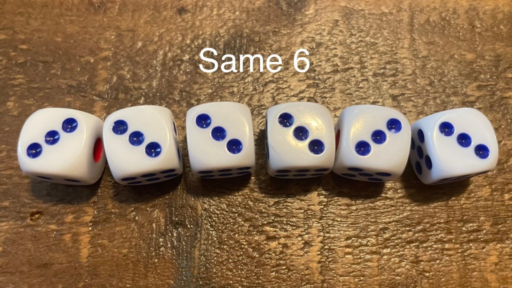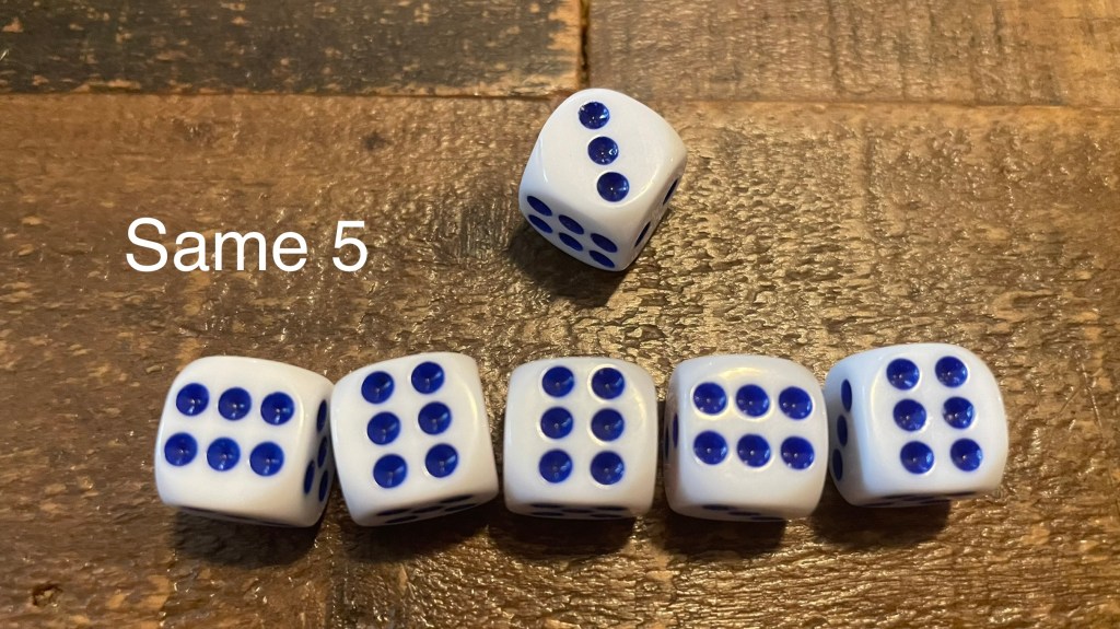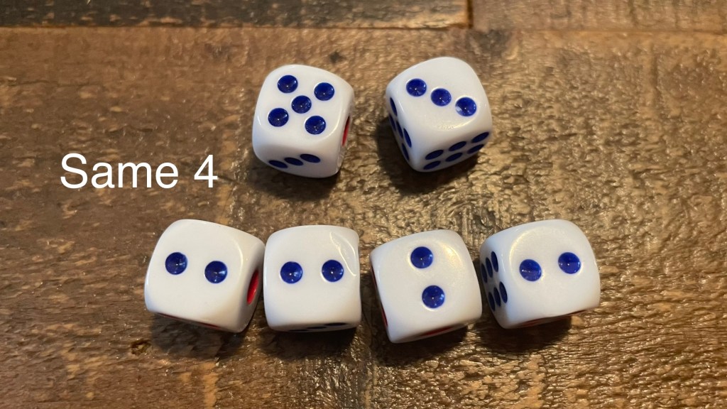 • For Same 5 or Same 6 combinations, a higher value will have a higher ranking. For example a Same 5 of 6s will outrank a Same 5 of 3s.