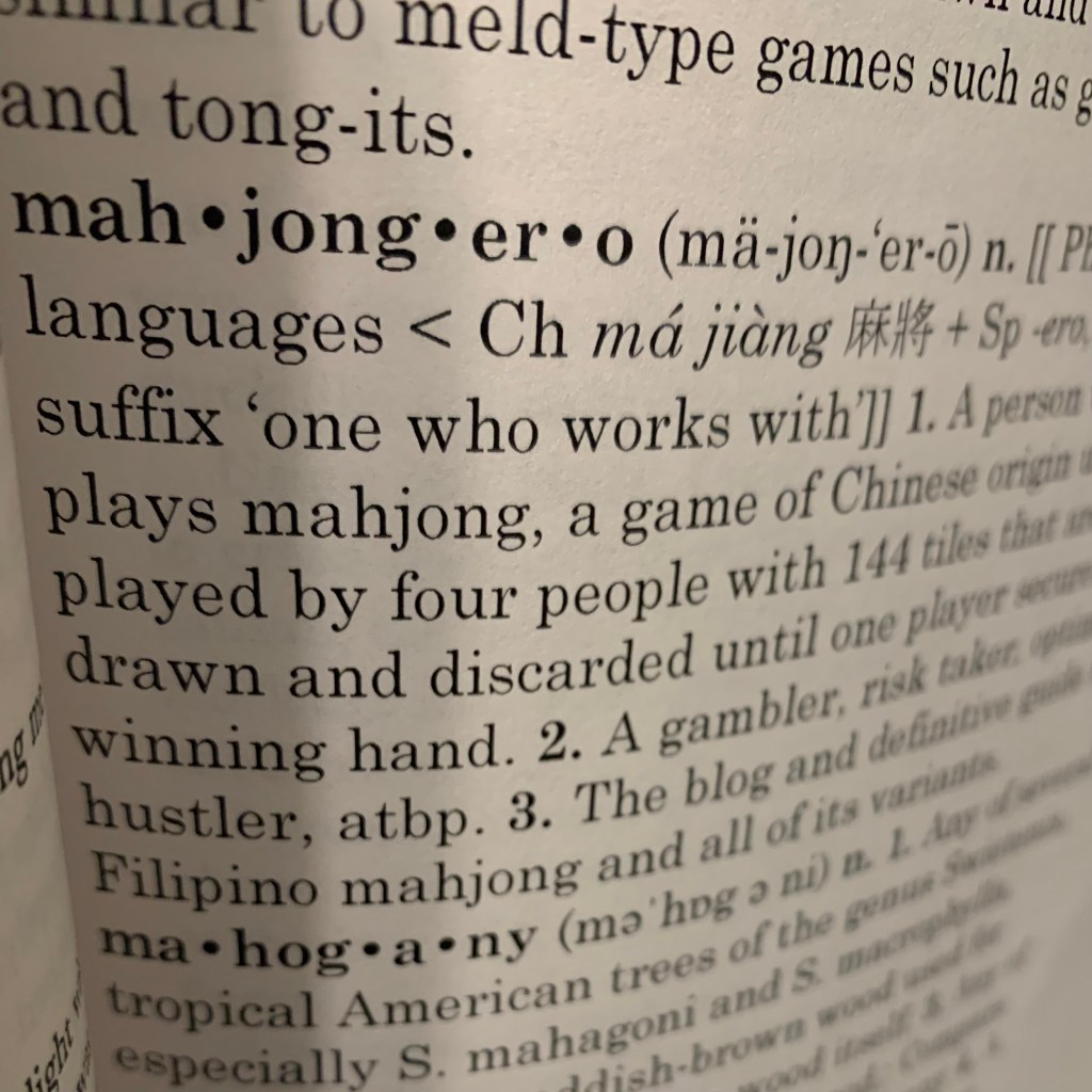 Used in Philippine languages, from Chinese má jiàng (麻將), the name of the Chinese game, and the Spanish agentive suffix -ero ‘one who works with’